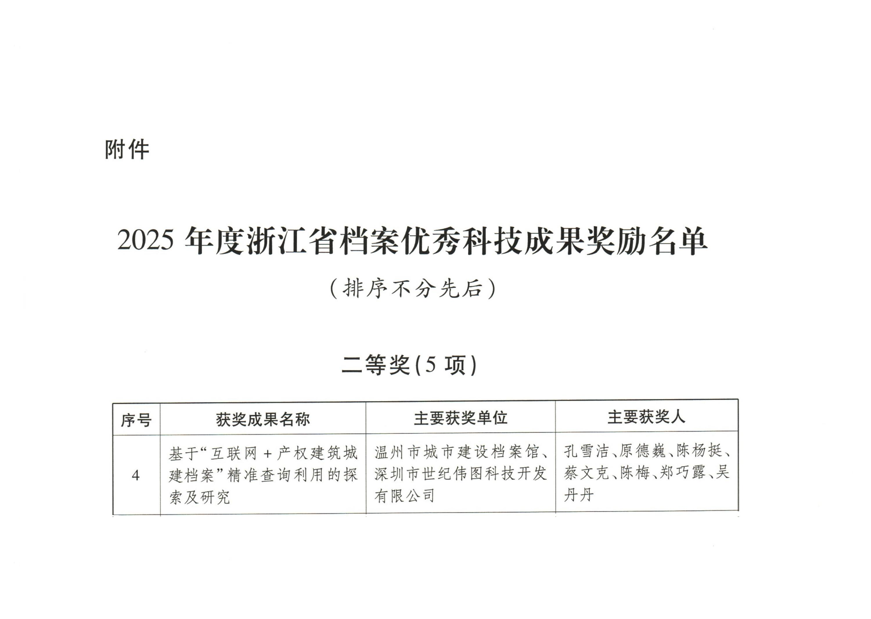 近日,浙江省档案局下发了《关于2025年度浙江省档案优秀科技成果奖励的通知》,由世纪伟图建设的温州市城市建设档案馆“基于‘互联网+产权建筑城建档案’精准查询利用的探索及研究”项目,荣获2025年度浙江省档案优秀科技成果二等奖。